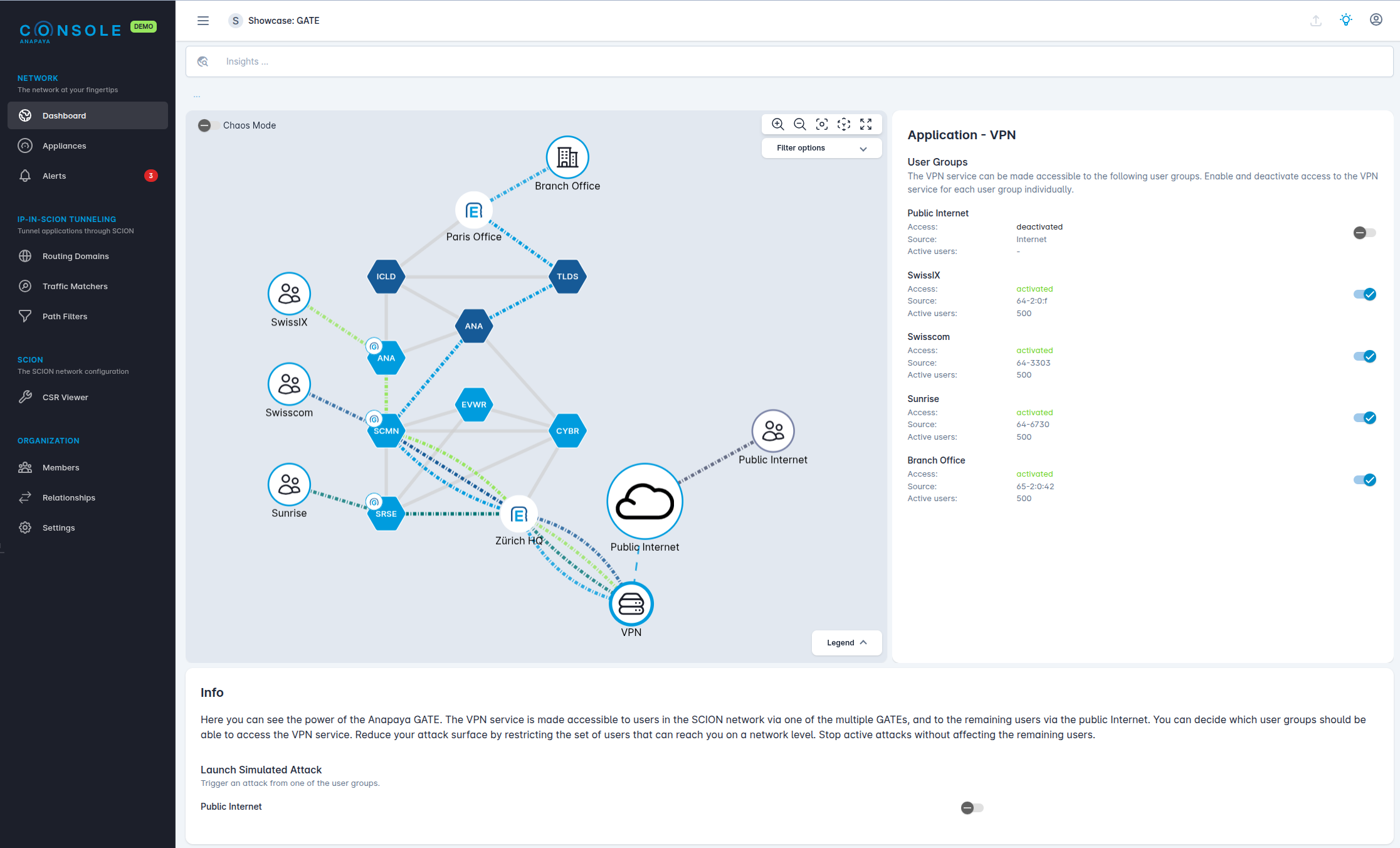 Experience the Anapaya CONSOLE firsthand with our interactive demo, featuring three practical use cases that demonstrate the capabilities and flexibility of SCION and the Anapaya product suite. Use this demo as your sandbox to explore both the Anapaya CONSOLE and the SCION Internet.
